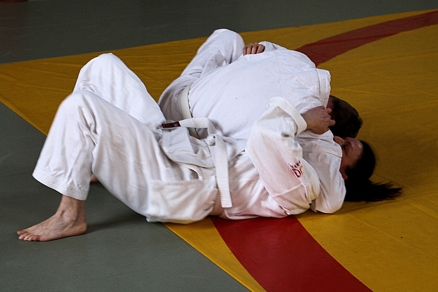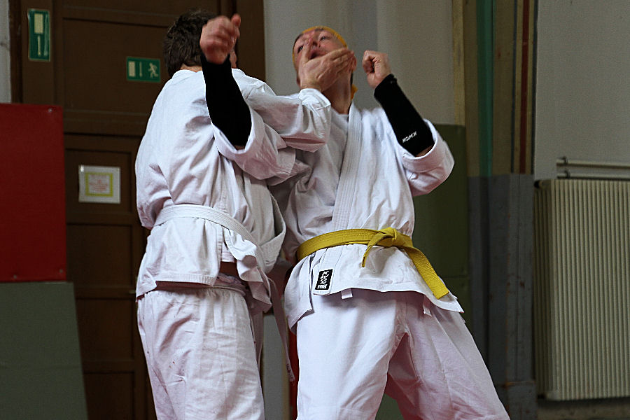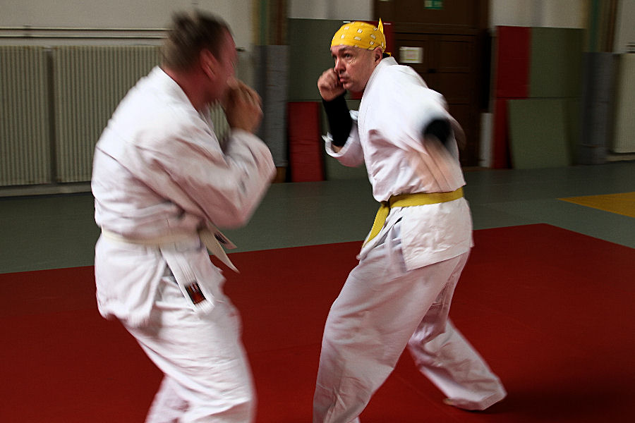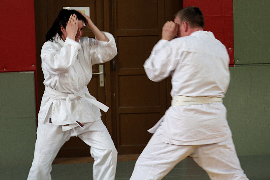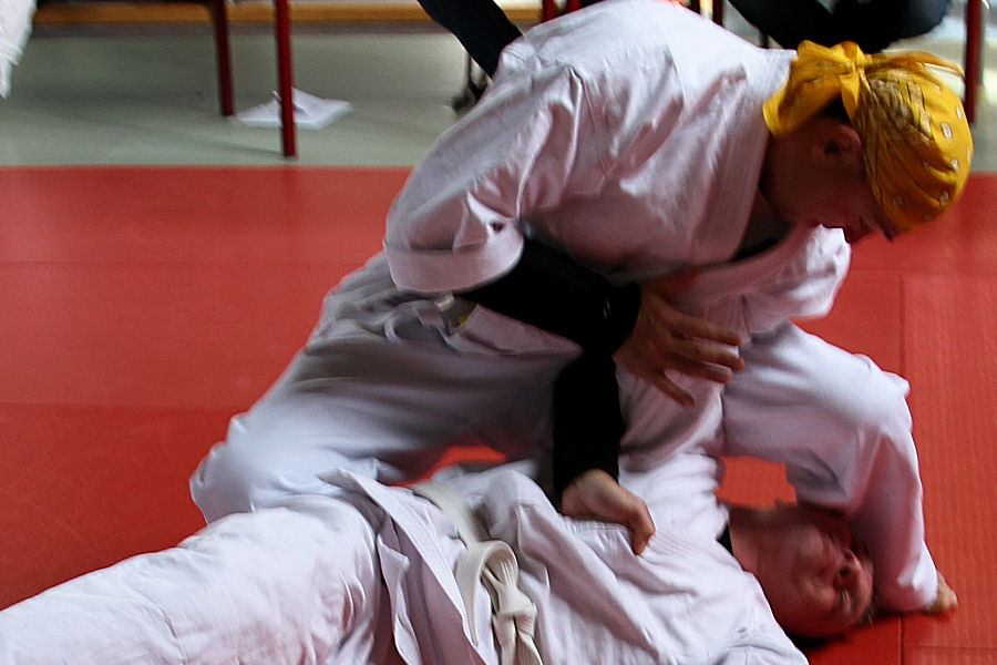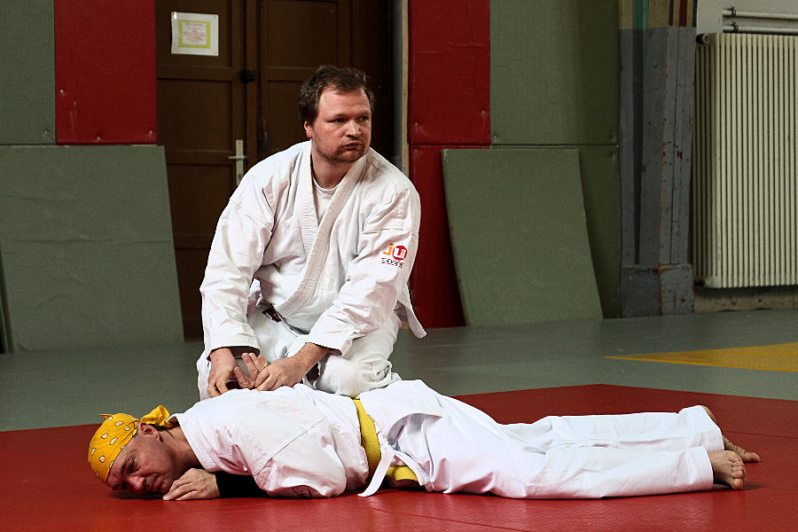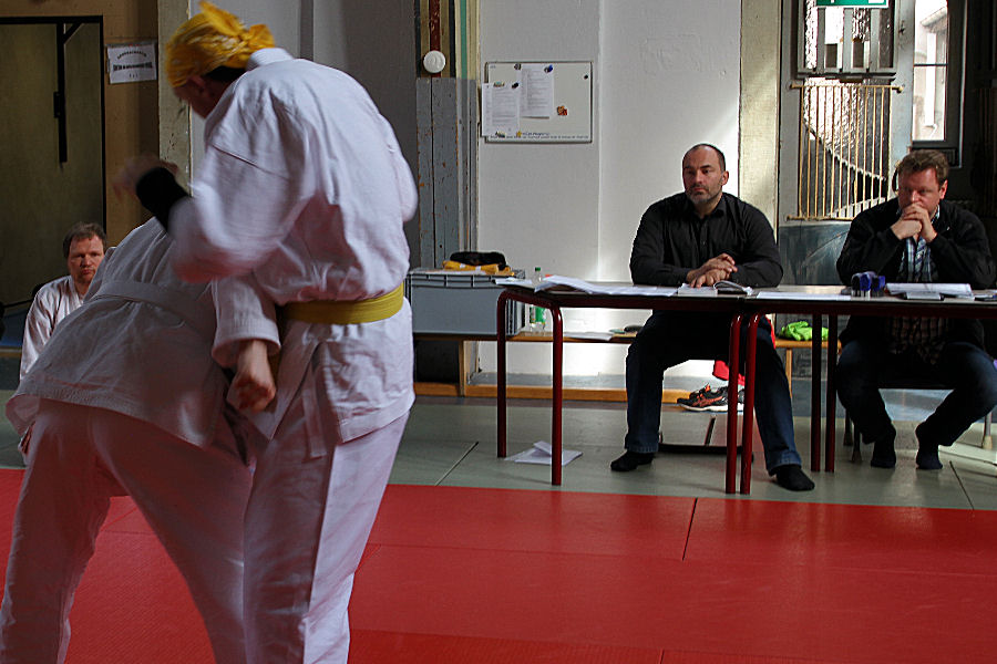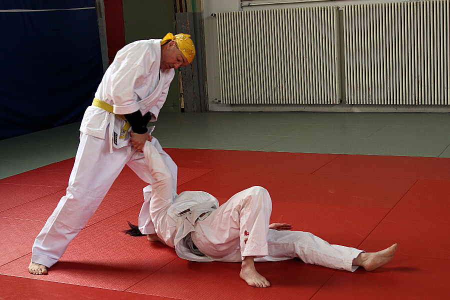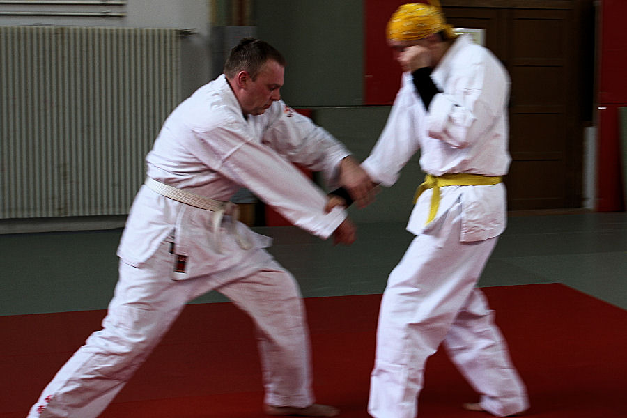 Es folgten Thomas, Martina, Nancy und Anja mit den Kombinationen des Gelbgurt-Programms und zuletzt war Andre an der Reihe, welcher sich auf den gelb-weißen Gürtel prüfen lies. Zum Schluss mussten dann noch mal alle zum sog. Tipp-Kampf auf die Matte.